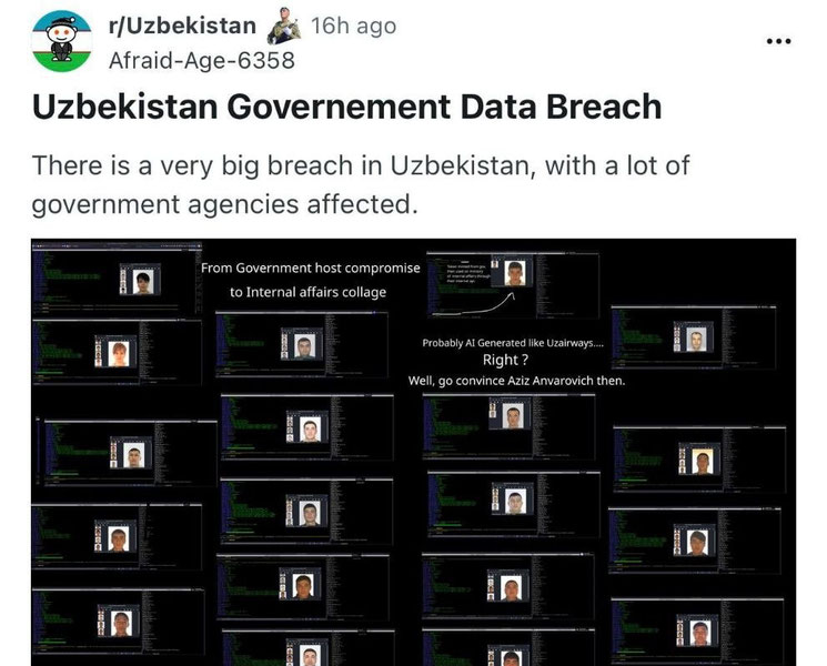 Ijtimoiy tarmoqlar va ayrim manbalarda hukumat tizimlaridan kamida 15 million O‘zbekiston fuqarosining shaxsiy ma’lumotlari o‘g‘irlanib, Dark Webga joylashtirilgani haqida xabarlar tarqaldi. Ma’lumotlarga ko‘ra, bazada shaxsni tasdiqlovchi hujjatlar va boshqa shaxsiy axborotlar mavjud bo‘lishi mumkin.