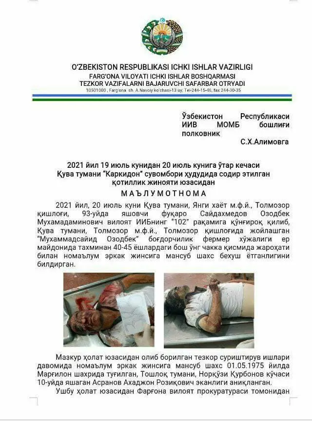 Мазкур ҳолат юзасидан 20 июль куни Фарғона вилояти прокуратураси томонидан Жиноят кодексининг 97 (қасддан одам ўлдириш) ва 164-моддалари (босқинчилик) билан жиноят иши қўзғатилган.