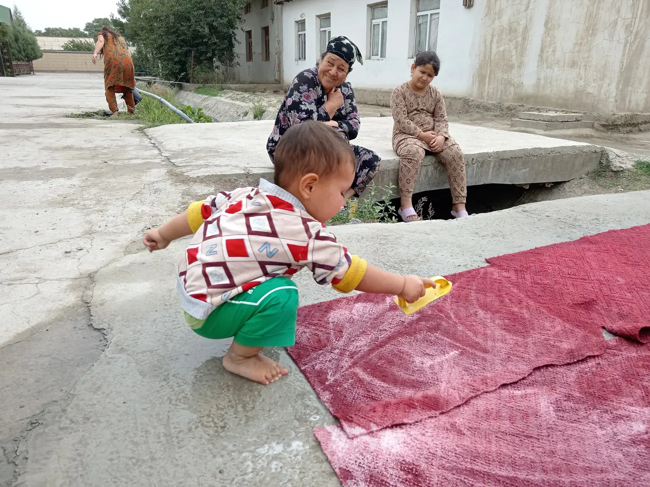 Avval tabiat uyg‘onadi — borliqdagi har bir tirik jon harakatga keladi. So‘ng bu sergaklik insonlarga o‘tadi: uyqudagi qizcha yuzini yuvadi, qumursqalar qatnovi boshlanadi, choy damlanadi, onalar hovlidagi kundalik ishlariga kirishadi. Shundan keyingina bayram boshlanadi. Bu fotohikoya hayitning hovli, oshxona va bolalar o‘yinidagi shukuhini tasvirlaydi.