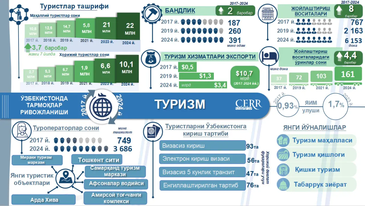 Tahlillarga ko‘ra, 2024 yilda mamlakatga tashrif buyurgan xorijiy sayyohlar soni 10,1 millionga yetdi, ichki sayyohlar oqimi esa 22 milliondan oshdi. Turizm eksporti hajmi 2017–2024 yillarda umumiy hisobda 10,7 milliard dollarga yetgan. Mutaxassislar fikricha, turizm yaqin yillarda O‘zbekiston iqtisodiy o‘sishining “lokomotivi” bo‘lish imkoniyatiga ega.