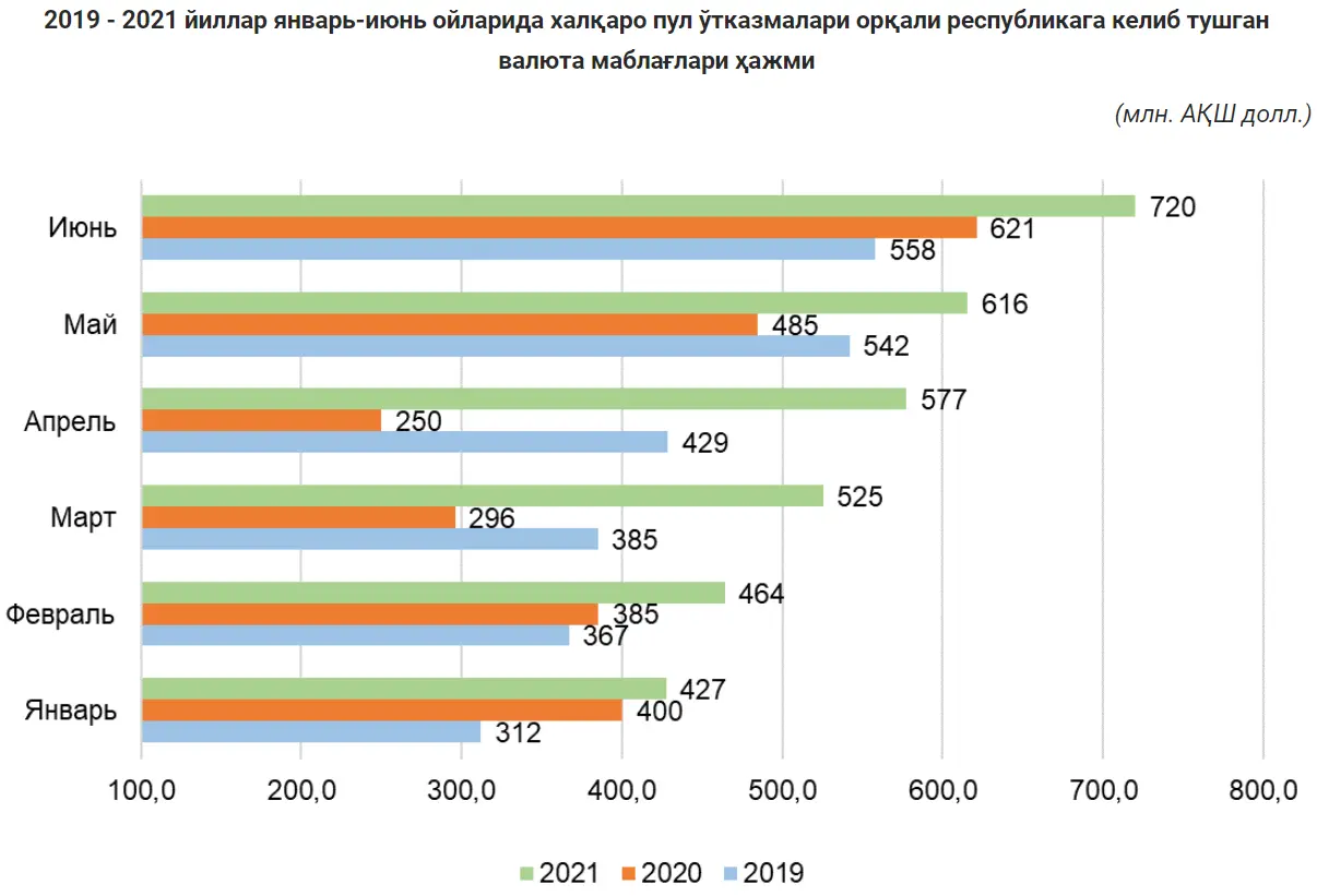 Mamlakatga 2021 yil boshidan buyon yuborilgan pul o‘tkazmalari hajmi har oy ortib borgan. Yanvar oyida 427 million dollar yuborilgan bo‘lsa, fevralda 463 million dollar, mart oyida 525 million dollar, aprelda 577 million dollar, mayda 616 million dollar yuborilgan. Iyunda esa bu ko‘rsatkich 720 million dollarni tashkil etgan.