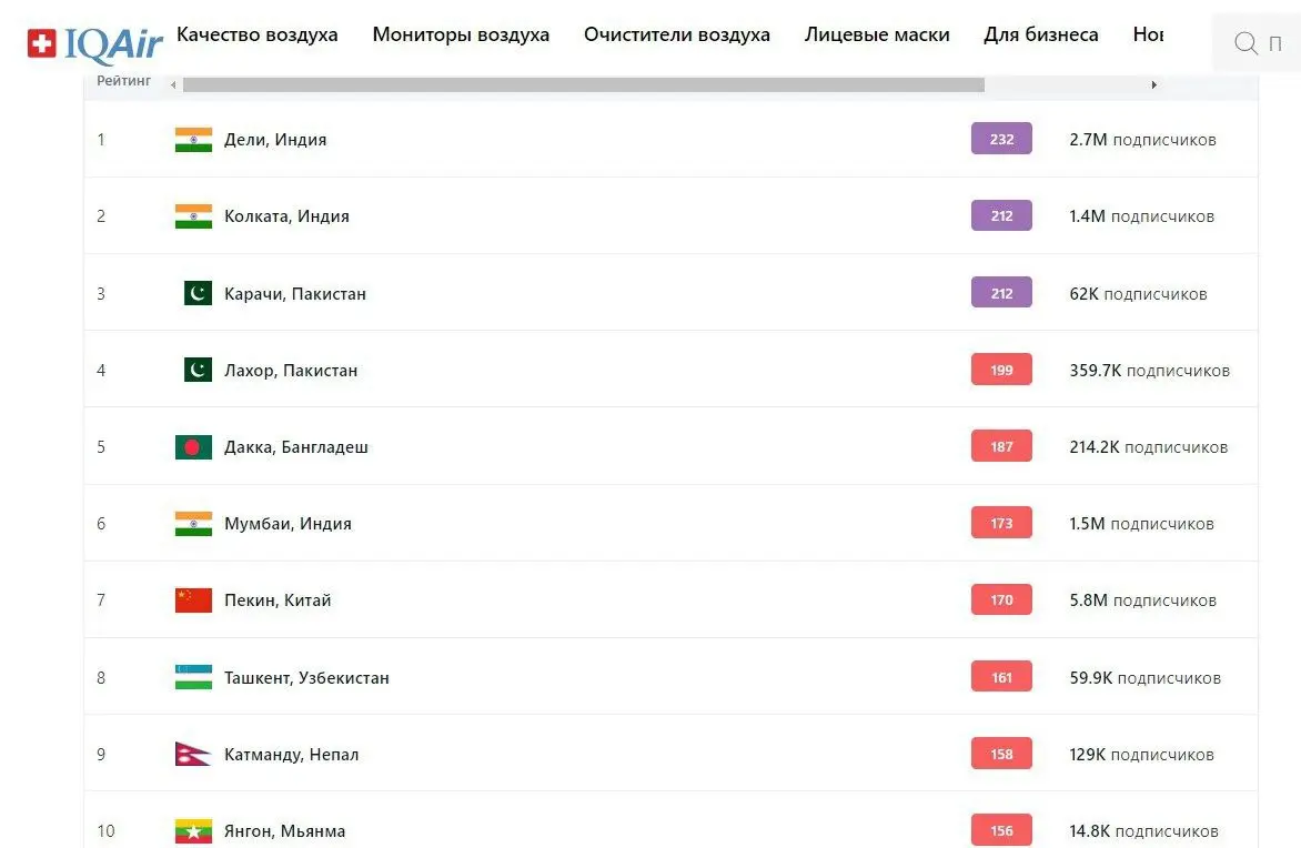 Рейтингда 1-ўринни Ҳиндистоннинг Деҳли шаҳри эгаллади - PM-2,5 дисперс зарраларининг концентрацияси 252 мкг/м3. Ҳиндистоннинг Калкутта шаҳри 2-поғонада - 203 мкг/м3. Учликка Покистоннинг Лаҳор шаҳри якун ясади - 196 мкг/м3.