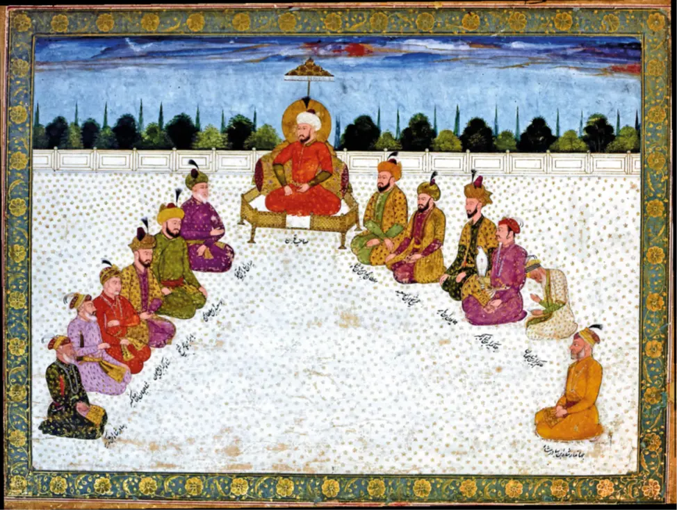 Ana shunday miniatyuralardan birida Amir Temur kompozitsiyaning markazida o‘tiribdi. U saltanat tojini o‘ng tomonida o‘tirgan Boburga topshirmoqda. Hokimiyat timsollaridan biri hisoblangan tojning topshirilishi ayni damda hukmron sulolaning qonuniyligini tasdiqlaydi. Sohibqiron temuriylar davri uslubida kiyingan, boshiga salla o‘ragan yetuk inson sifatida tasvirlangan va uning umumiy ko‘rinishiga ham Boburiylarga o‘xshash xususiyatlar aks etgan. Chap tomonda Boburning o‘g‘li Humoyun (1530–1545) tasvirlangan.