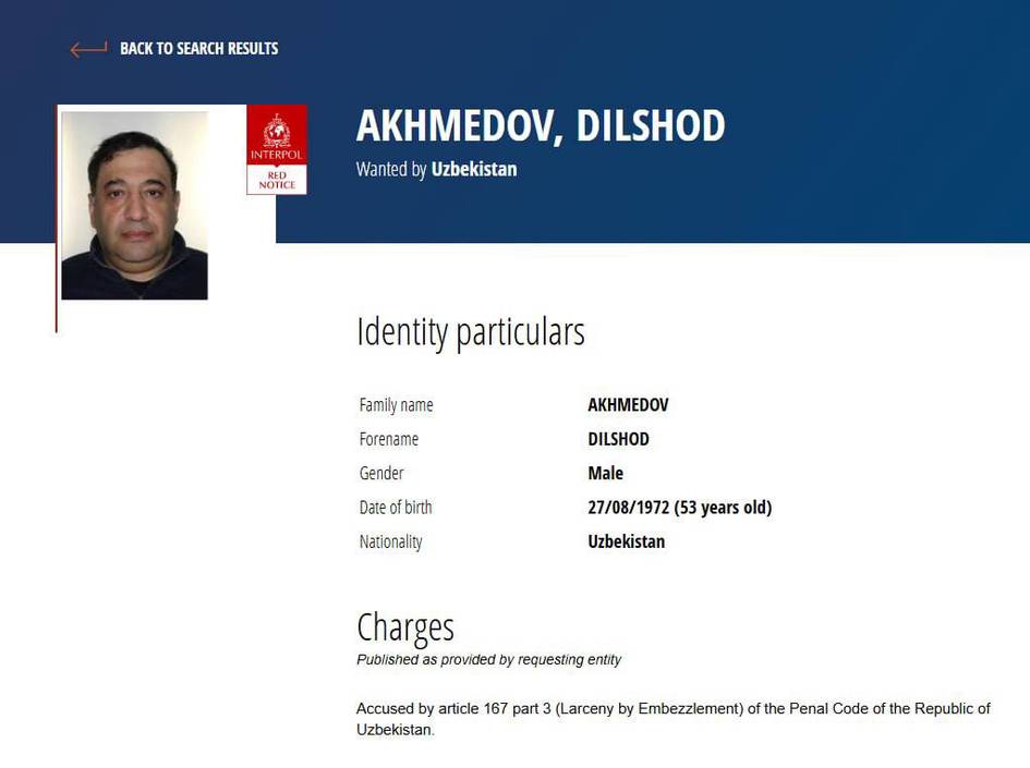 Согласно данным Интерпола, ему предъявлено обвинение по части 3 статьи 167 Уголовного кодекса Узбекистана — присвоение или растрата.