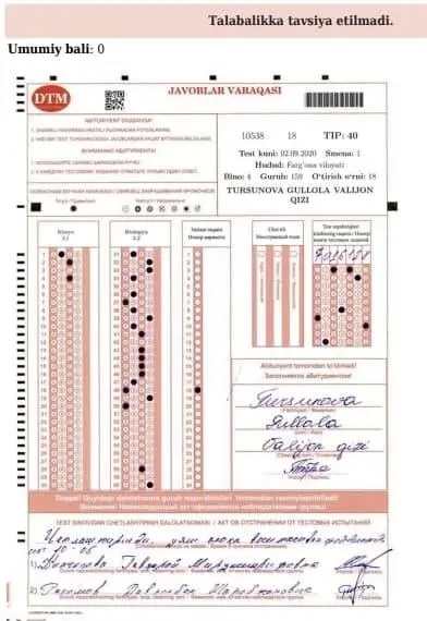 Кимё фанидан тест топшириқлари акс етган 7016128 рақамли тест топшириқлари китоби 2020-йилда ўтказилган тест синовларига тааллуқли бўлиб, мазкур абитурийент тест синови вақтида телефондан фойдаланаётгани аниқланиб, далолатнома асосида тест синовларидан четлаштирилган.