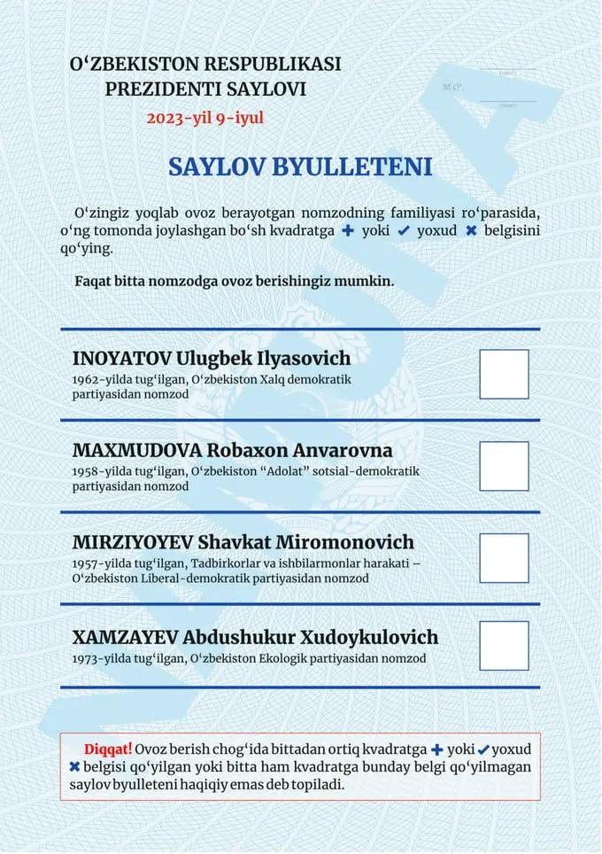 Қайд этилишича, Ўзбекистон президентлигига номзодларнинг фамилияси, исми ва отасининг исми сайлов бюллетенига, сайлов участкасида овозларни санаб чиқиш натижалари ҳамда сайлов округи бўйича сайлов натижаларини аниқлаш тўғрисидаги баённомаларга лотин ёзувига асосланган ўзбек алифбоси тартибида киритилади.