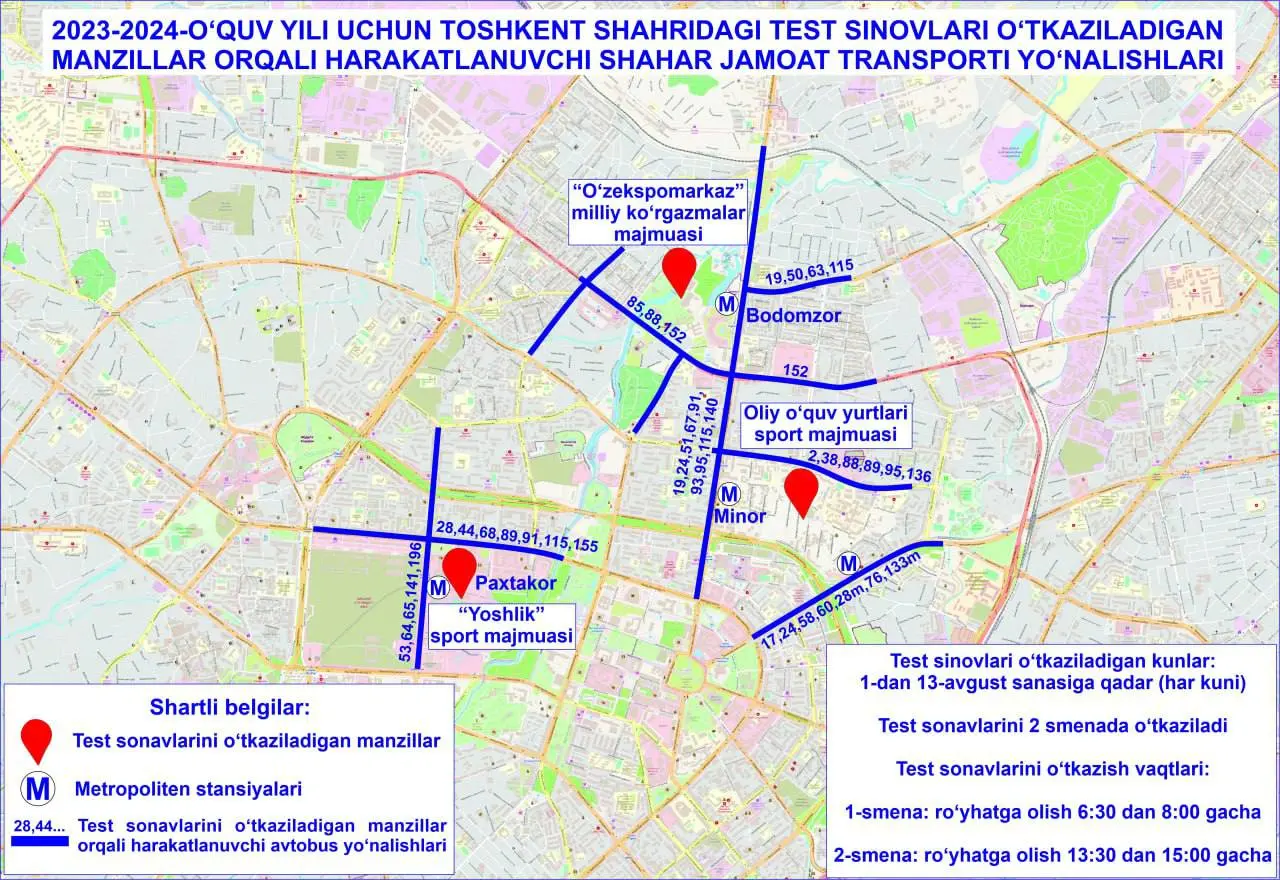 Тест синовлари ўтказиладиган манзиллар орқали ҳаракатланувчи шаҳар жамоат транспорти йўналишлари (19, 50, 63, 115, 85, 88, 152, 24, 51, 67, 91, 93, 95, 140, 2, 38, 89, 136, 44, 68, 155, 17, 58, 60, 76, 53, 64, 65, 141, 196, 133м ва 28м) билан юқоридаги суратда келтирилган.