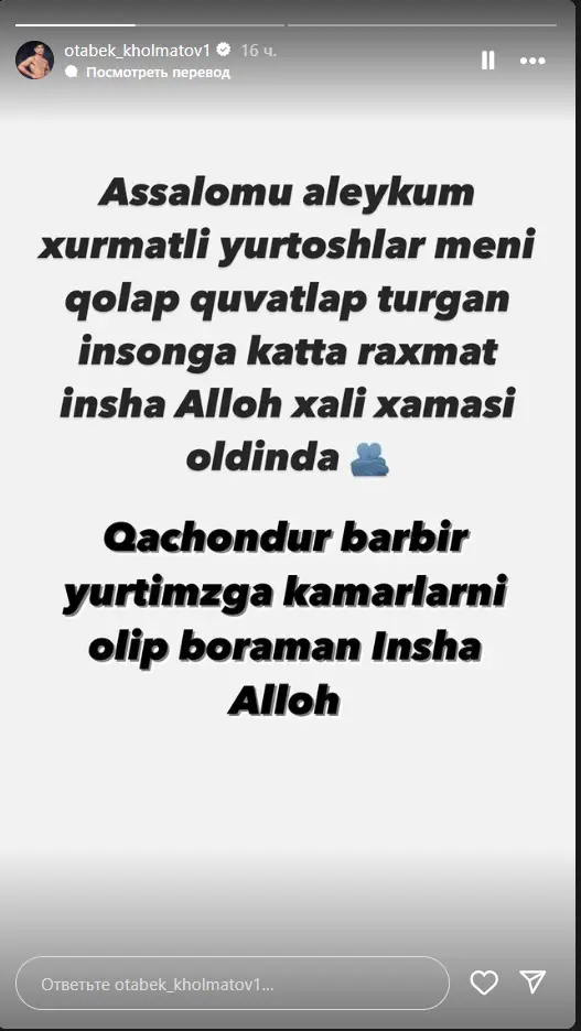"Ассалому алайкум, ҳурматли юртдошлар. Мени қўллаб-қувватлаган инсонларга катта раҳмат. ИншаАллоҳ, ҳали ҳаммаси олдинда. Қачондир, барибир юртимизга камарларни олиб бораман, ИншаАллоҳ", — деди боксчи.