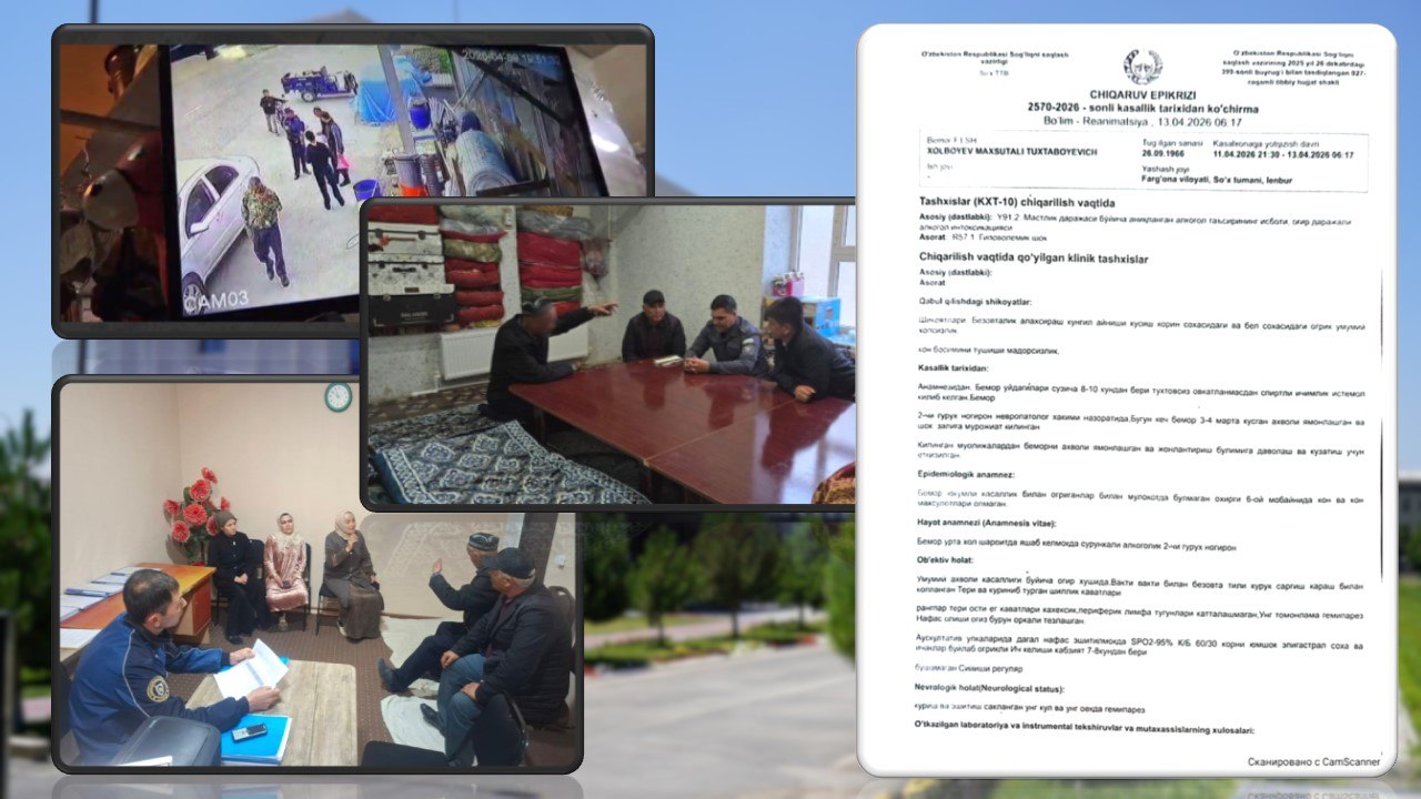 Хабарга кўра, ушбу фуқаро сўнги 8-10 кун давомида овқат емасдан фақат спиртли ичимлик истеъмол қилганлиги сабабли саломатлиги ёмонлашиб, 11 апрель куни тиббиёт муассасасининг жонлантириш бўлимига ётқизилган. Кўрсатилган муолажаларга қарамасдан 13 апрель куни шифохонада вафот этган.