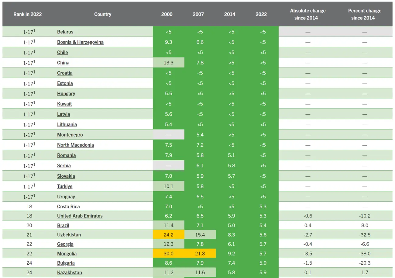 Глобал очлик индекс кўрсаткичлари мавжуд бўлмаган мамлакатлар ва баъзи бир юқори даромадли мамлакатлар, аҳолиси кам мамлакатлар ва мустақил бўлмаган ҳудудлар учун ҳисобланмаган.