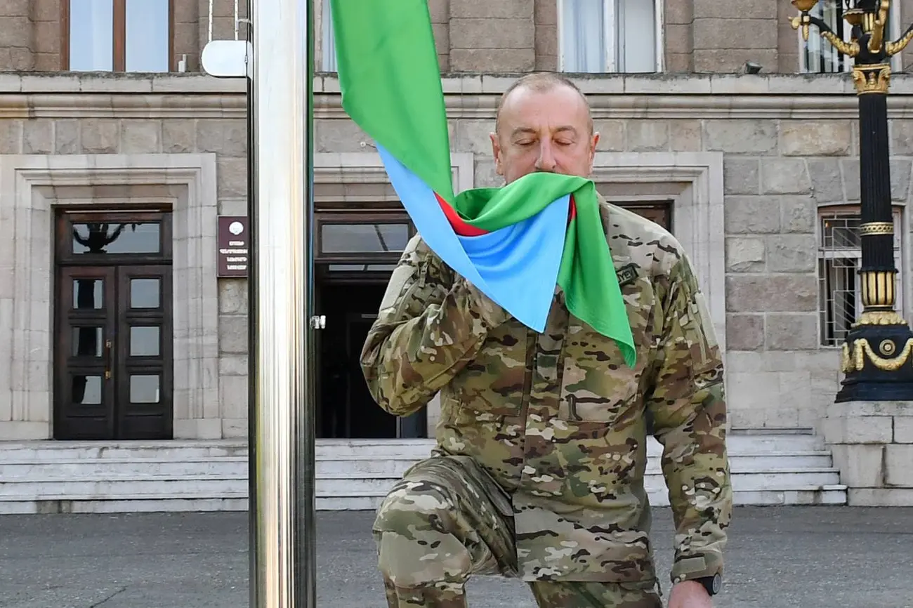 Озарбайжон президенти Илҳом Алиев Қорабоғ маркази — Боку Хонкенди деб атайдиган Степанакертда давлат байроғини кўтарди.