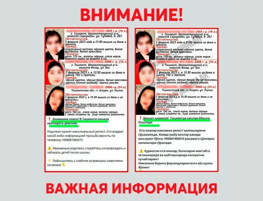 Ижтимоий тармоқларда Тошкентда қизлар йўқола бошлагани ҳақида хабарлар тарқалмоқда. Ички ишлар вазирининг матбуот котиби Шохруҳ Ғиёсовга кўра, Telegram’да тарқалган қизларнинг ғойиб бўлаётгани ҳақидаги хабарлар гўёки бу воқеалар бир-бири билан узвий боғлиқдек тасаввур уйғотсада, ҳақиқатга тўғри келмайди. Буни қизларнинг турли кунларда, турли жойларда ғойиб бўлгани ҳам тасдиқлайди.