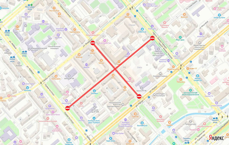 Шунингдек, 17 декабрдан 5 январгача Тарас Шевченко гастрономик-туризм кўчасида ҳам вақтинчалик чекловлар амал қилади. Бу даврда Тарас Шевченко кўчасининг Фидокор кўчасидан Нукус кўчасигача, ҳамда Саййид Барака кўчасининг Ойбек кўчасидан Амир Темур шоҳкўчасигача бўлган қисми ёпилади. Ҳайдовчилардан ўз ҳаракат йўналишларини олдиндан режалаштириш сўралди.