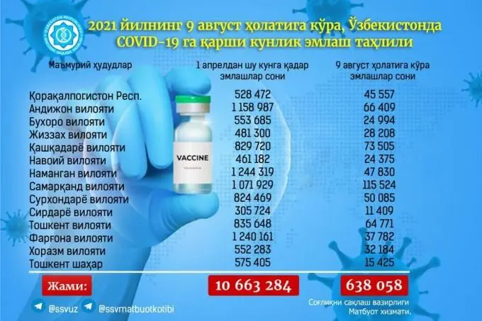 O‘zbekistonda 9 avgust kuni COVID-19 ga qarshi 638 058 doza vaksina qo‘llanildi, deb xabar bermoqda Sog‘liqni saqlash vazirligi. Shundan 558 416 doza birinchi bosqichda, 69 138 doza ikkinchi bosqichda va 10 504 doza uchinchi bosqichda qo‘llanilgan.