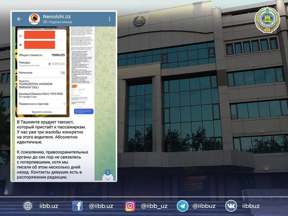 “Nemolchi.uz” internet-manbasida uch nafar ayollarga shilqimlik qilgan taksi haydovchisiga nisbatan huquqni muhofaza qiluvchi organlar tomonidan chora ko‘rilmayotgani haqida xabar eʼlon qilindi.