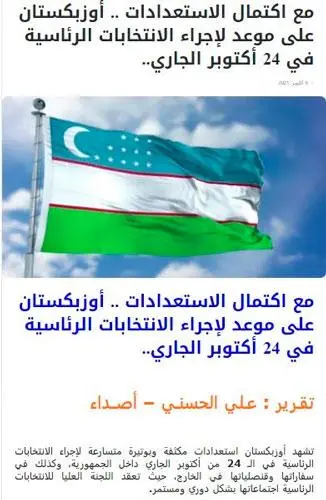 Qayd etilishicha, gazeta muxbiri Ali al-Hasaniy tomonidan tayyorlangan materialda joriy yilning 24-oktabr kuni O‘zbekistonda o‘tkaziladigan Prezident saylovi kampaniyasining borishi, mamlakatda va xorijdagi vakolatxonalar huzurida tashkil etilgan saylov uchastkalarida ovoz berish uchun yaratilayotgan sharoitlar va nomzodlar haqida batafsil axborot berilgan.