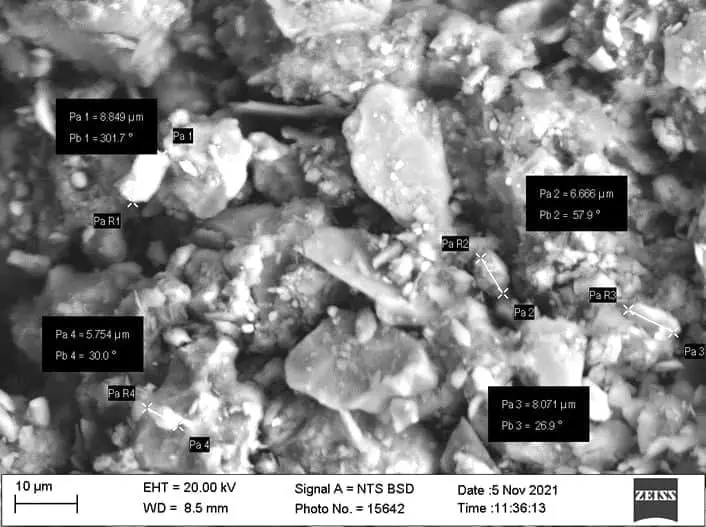 Chang tarkibi SmartSEM dasturiy taʼminot yordamida 100 mkm dan 1 mkm gacha bo‘lgan turli masshtablarda olindi.