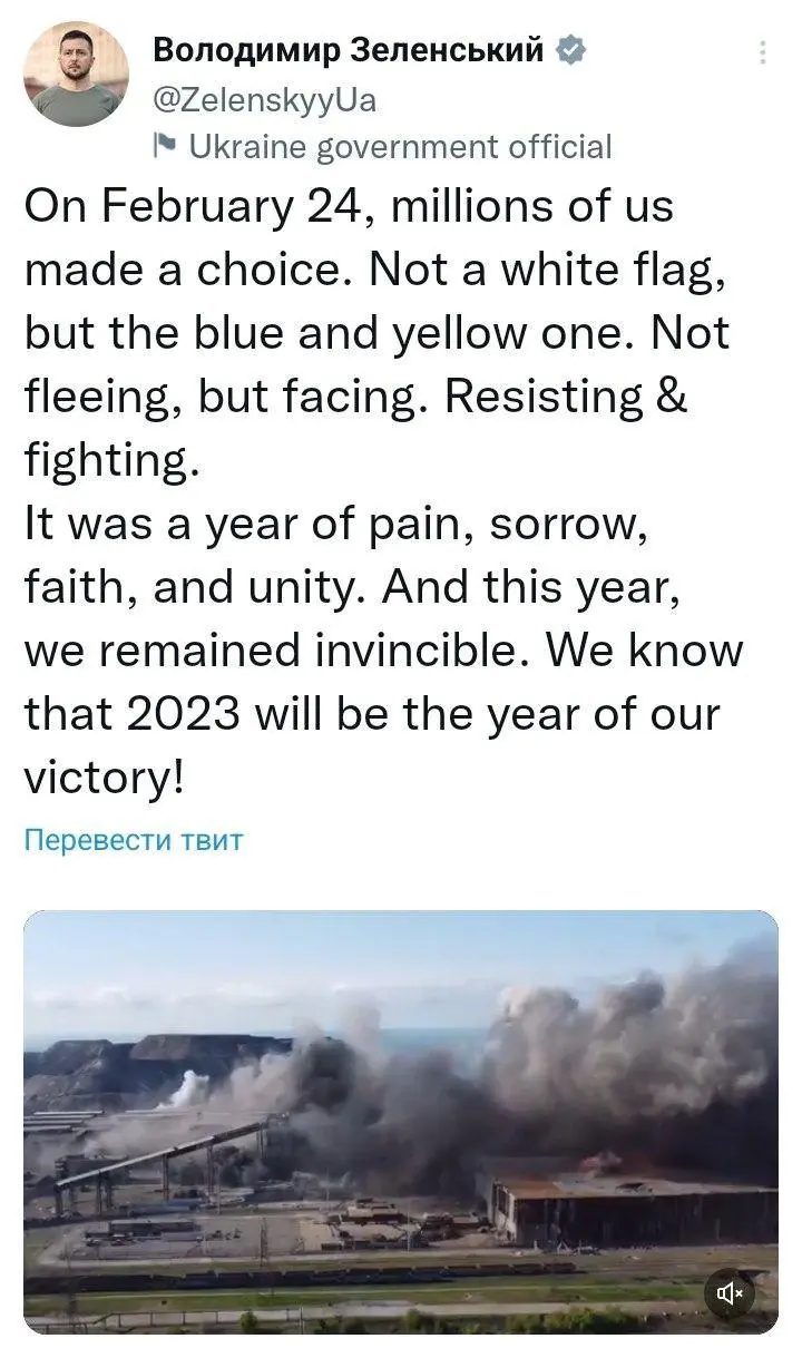 2023 yil Ukraina g‘alabasi yili bo‘ladi. Bu haqda prezident Vladimir Zelenskiy Twitter sahifasida yozdi.