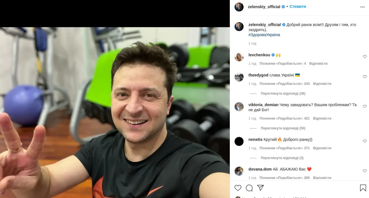 Ukraina prezidenti Vladimir Zelenskiy Instagram‘dagi eng katta auditoriyaga ega obunachilardan. Uni ayni paytda 16,9 million muxlisga ega. Bundan tashqari, Ukraina yetakchisini 7,3 million X‘da, 3,2 million Facebook foydalanuvchisi kuzatib bormoqda. Shuningdek, Zelenskiy Telegram‘da ham juda faol.