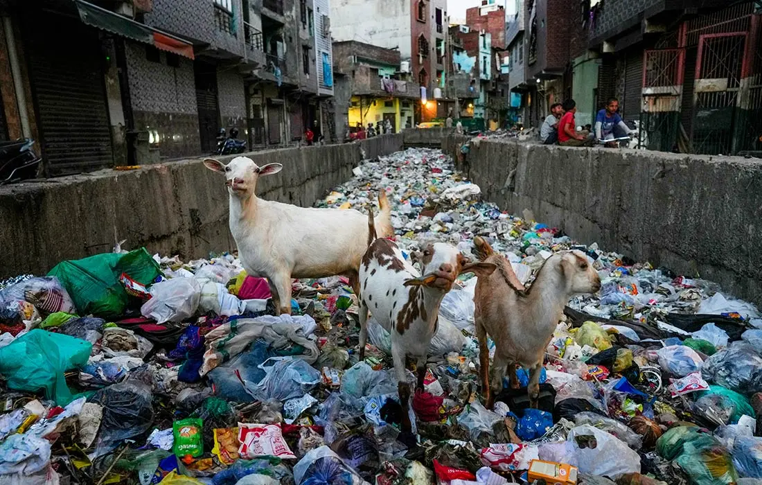 Yangi Dehlidagi chiqindi bilan to‘ldirilgan kanalda echkilar ovqat qidirmoqda