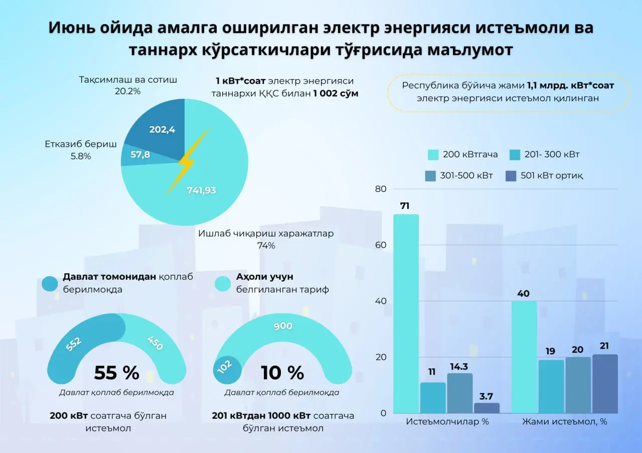 ▪️Iyun oyida 71 foiz aholi 200 kVtgacha elektr energiyasi isteʼmol qilgan, yaʼni bazaviy meʼyor doirasidan chiqmagan.