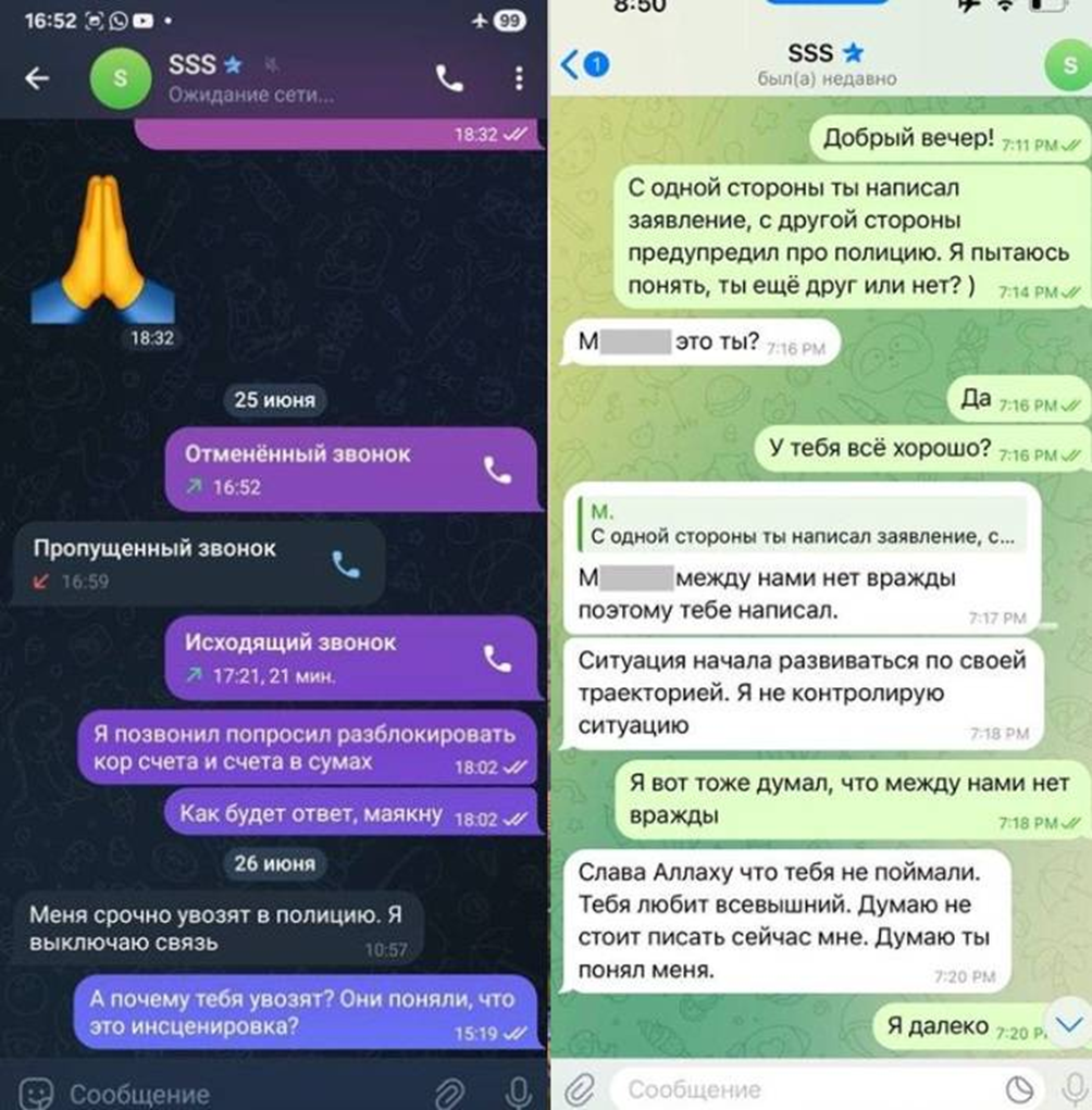 “Odam o’g’risi” va “jabrlanuvchi” o‘rtasidagi muloqot oradan ikki kun o‘tib, 28-iyun kuni M. Olimovga yangi raqamdan “Bir tomondan ariza yozding, ikkinchi tomondan meni politsiyadan ogohlantirding. Hali ham do‘stmisan yoki yo‘q, buni bilmayapman? ” deb SMS yozganida, Olimov: “Oramizda dushmanlik yo‘q, shuning uchun senga yozdim. Vaziyat o‘z trayektoriyasi bo‘yicha ketyapti. Men vaziyatni nazorat qilmayapman”. So‘ng, Olimov M.ga quyidagicha xabar qoldiradi: “Allohga shukur, seni ushlashmadi. Xudo seni yaxshi ko‘radi. Hozir menga yozmasliging kerak deb o‘ylayman. O‘ylaymanki, sen meni tushunding”.