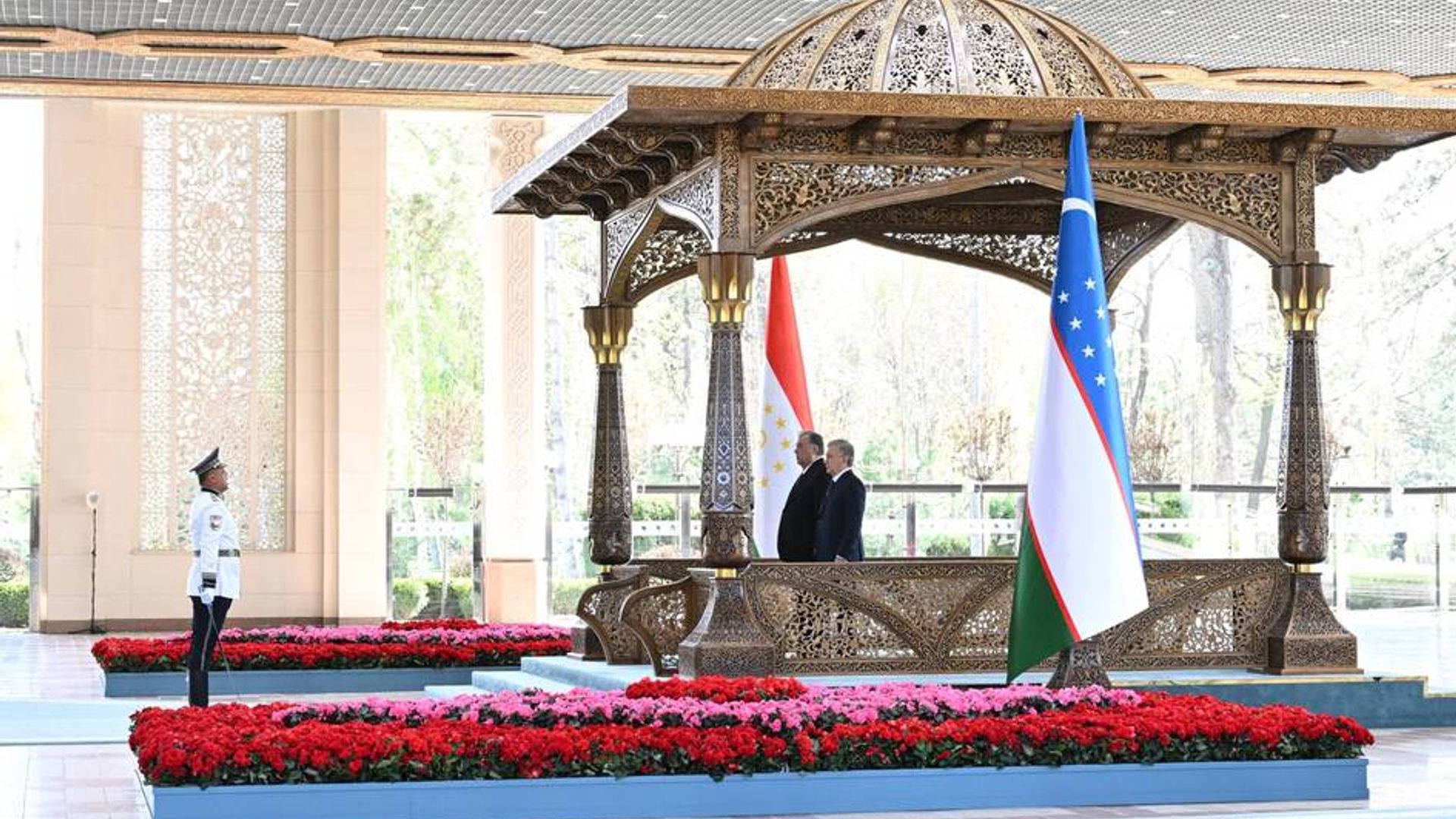 Yetakchilar faxriy qorovul safi oldidan o‘tib, rasmiy delegatsiyalar a’zolarini qutladilar. Birgalikda suratga tushilgandan so‘ng O‘zbekiston va Tojikiston Prezidentlarining muzokaralari boshlandi.