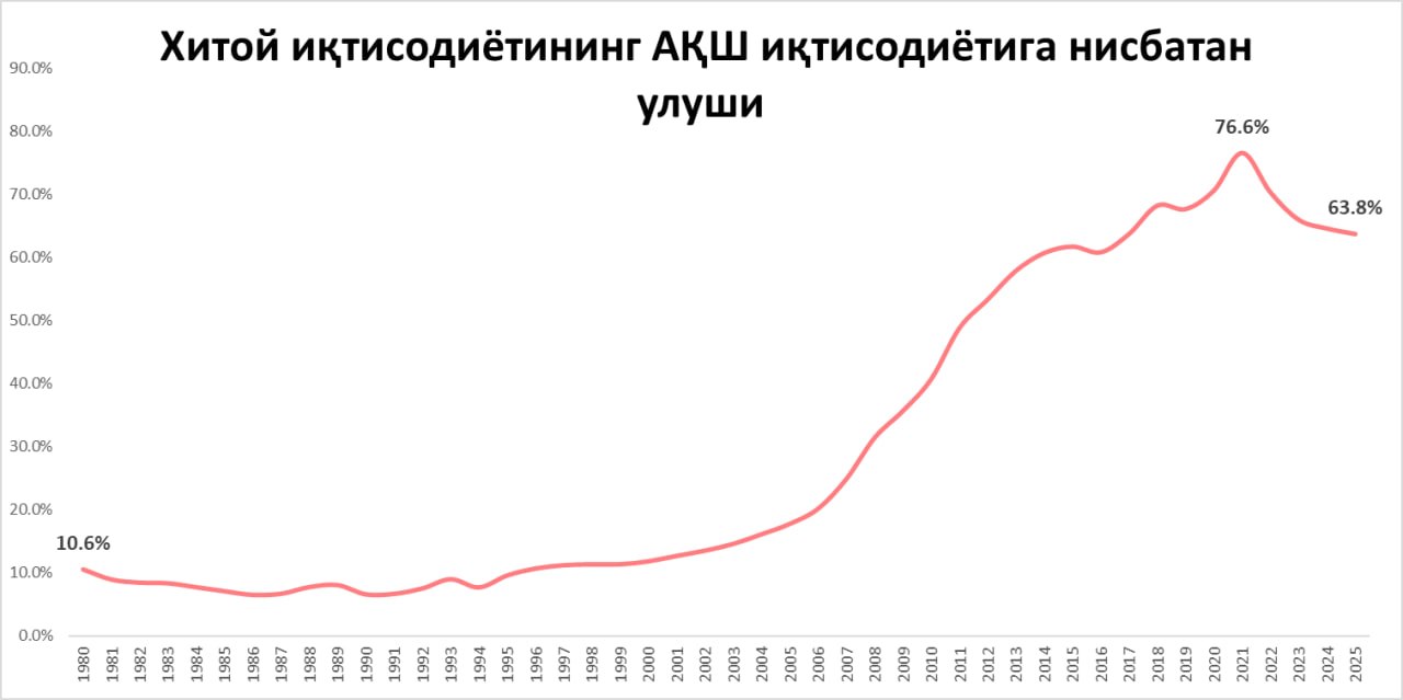 2010-yillarda Xitoy AQSH iqtisodiyotini qachon quvib o‘tishi bo‘yicha prognozlar doimiy muhokama mavzusiga aylangan edi. 2014-yildagi XVJ prognozlarida 2019-yilga borib Xitoy AQSH iqtisodiyotini quvib o‘tishini prognoz qilgan. Lekin 2026-yilga kelib bu mavzu aktualligini yo‘qotgandek go‘yo. 2025-yilda AQSH iqtisodiyotining nominal hajmi 30,8 trln dollarga yetgan bo‘lsa, Xitoy iqtisodiyoti 20 trln dollarni tashkil etgan. Shuningdek, Xitoy iqtisodiyotining AQSHga nisbatan ulushi ketma-ket to‘rtinchi yil pasaymoqda. 2021-yilda Xitoyning AQSH iqtisodiyotiga nisbatan ulushi 76,6 foizni tashkil etgan bo‘lsa, 2025-yilga kelib bu ko‘rsatkich 63,8 foizgacha pasaygan.