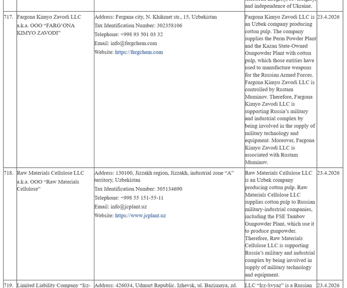 O‘zbekistonning 2 ta kompaniyasi — Farg‘ona Kimyo Zavodi va Raw Materials Cellulose ham Yevropa ittifoqining 20- paketi doirasidagi sanksiyalar ro‘yxatiga kiritildi. Bu haqda iqtisodchi Otabek Bakirov xabar berdi.